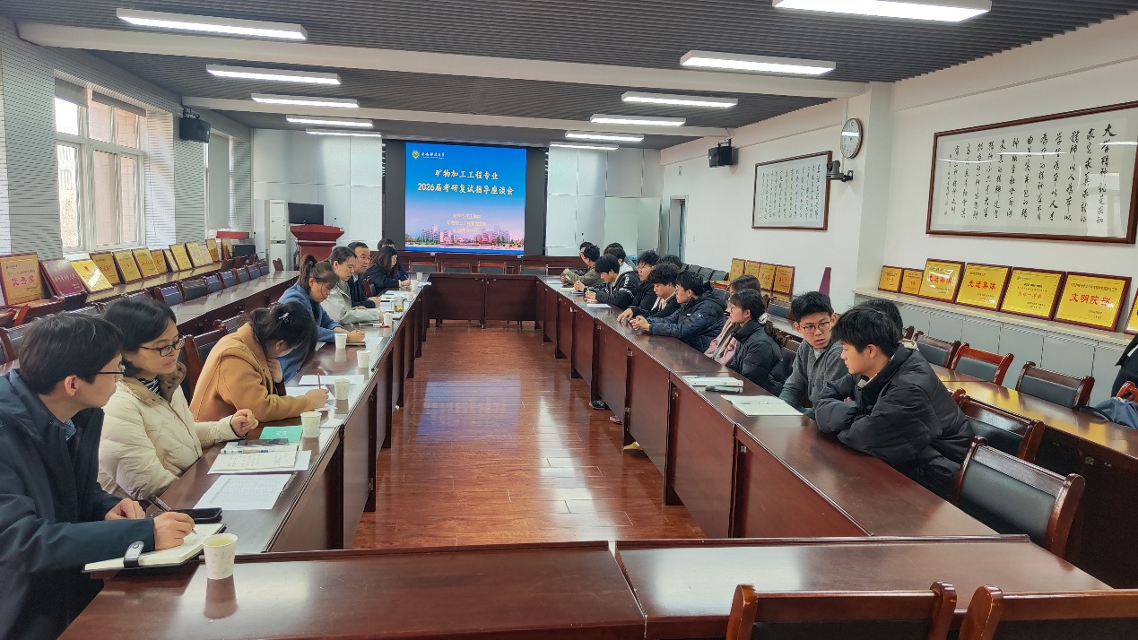 为扎实推进树立和践行正确政绩观学习教育,引导党员干部将正确政绩观内化于心、外化于行,切实转化为服务师生成长发展的实际行动,我院矿物加工系党支部聚焦学生“急难愁盼”,落实落细“一人一策”精准帮扶机制,于3月11日上午在临潼校区骊山校园学院会议室召开2026届考研复试指导座谈会,以务实举措助力学子研途圆梦。此次座谈会由系主任屈进州主持,化工学院党委书记肖阳、矿加系支部书记常静、矿加系专任教师、毕业班辅导员与2026届考研上线学生面对面交流,现场气氛热烈。