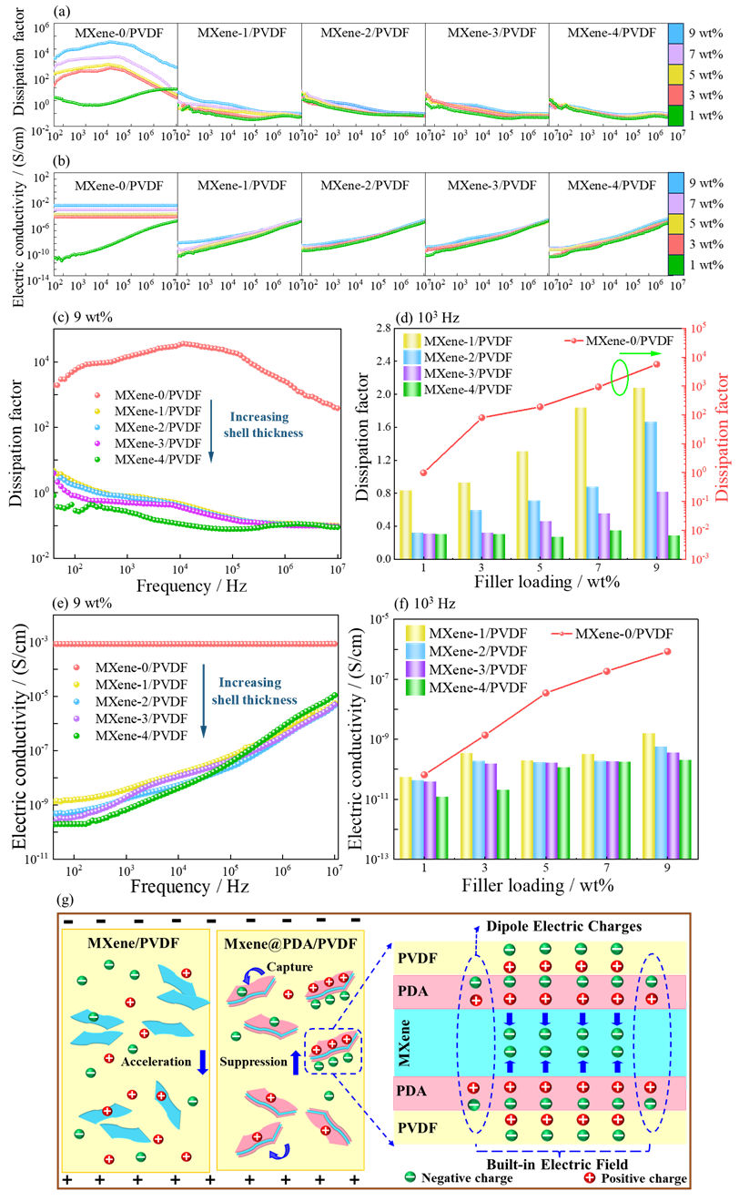 图 3. (a‑b)不同填料类型与含量下纳米复合材料的介电损耗、电导率随频率变化;(c)不同复合体系的介电损耗随频率变化;(d)所制备纳米复合材料的性能对比;(e)纳米复合材料在宽频范围内的电导率谱;(f)所有研究体系的电导率直接对比;(g)MXene@PDA/PVDF纳米复合材料内建电场示意图