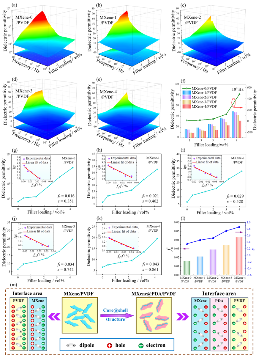 图 2. (a‑e)不同纳米填料及含量下复合材料的介电常数随频率变化曲线;(f) 103Hz时介电常数随填料填充量的变化曲线;(g‑k) 103Hz时介电常数与(fc−f)的双对数拟合图(fc为渗流阈值,f为填料体积分数);(l) 拟合参数fc与s随PDA壳层厚度的变化;(m)纯MXene与MXene@PDA填充PVDF复合材料的介电极化机理示意图