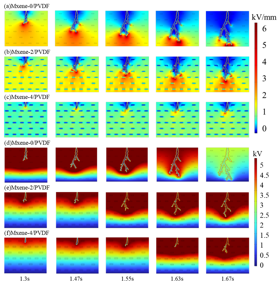 图 4. (a‑c)MXene与MXene@PDA填充PVDF纳米复合材料中电树枝随时间的演化过程;(d‑f)对应的电场分布云图