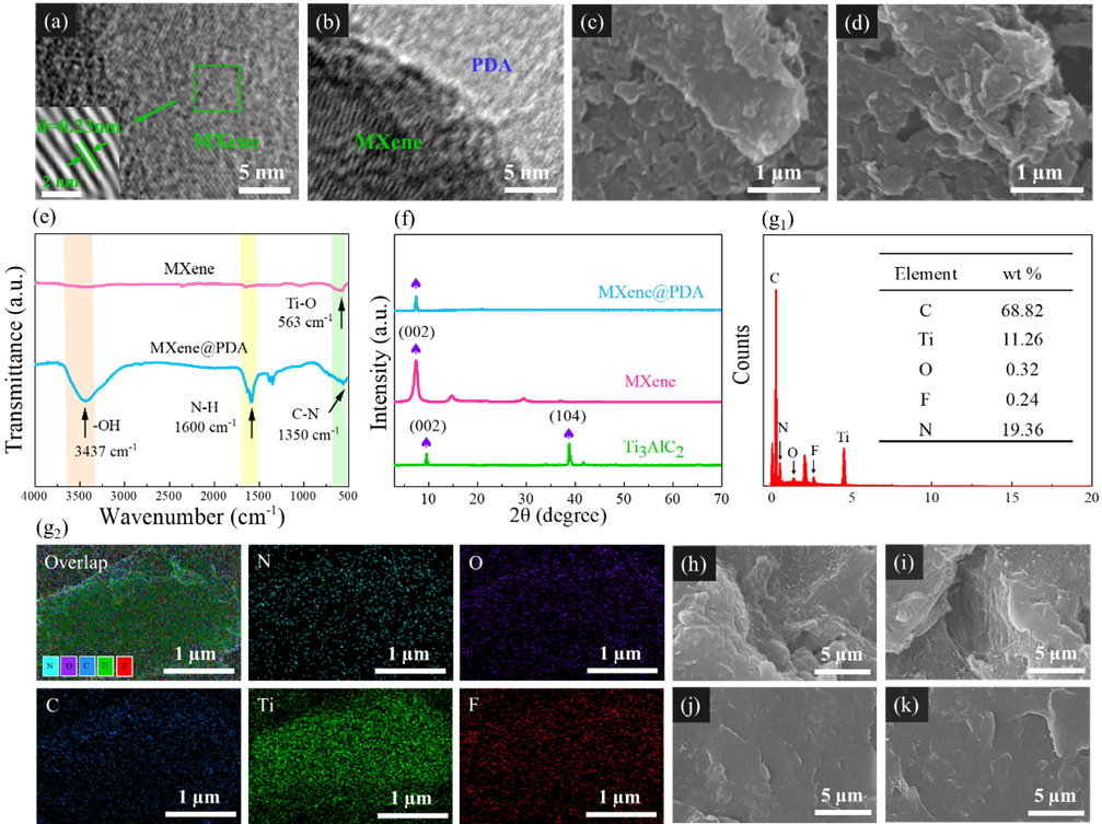 图 1. (a‑b)未改性MXene与MXene@PDA的透射电镜图;(c‑d)制备态MXene及其聚多巴胺包覆样品的扫描电镜图;(e) 红外光谱对比;(f) Ti3AlC2、MXene与MXene@PDA的X射线衍射图谱;(g)MXene@PDA的能谱元素面分布图;(h‑i)纯MXene/PVDF纳米复合材料的断面扫描电镜图;(j‑k)MXene@PDA/PVDF复合材料的对应断面电镜图